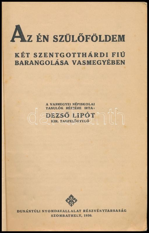 Dezső Lipót: Az én szülőföldem. Két szentgotthárdi fiú barangolása Vasmegyében. Szombathely, 1930., Dunántúli Nyomdavállalat Rt., 147+1 p.+44 (fekete-fehér fotók) t. Kiadói papírkötés, kopott, foltos borítóval.