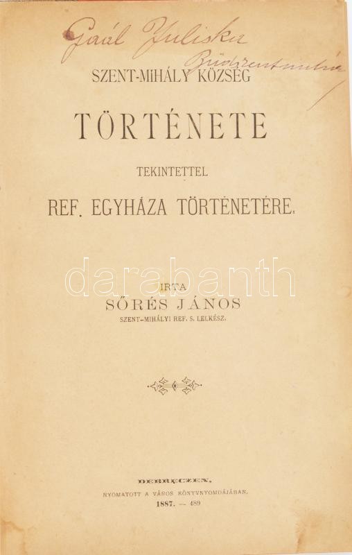 Sőrés János: Szent-Mihály (Bűdszentmihály) község története tekintettel ref. egyháza történetére. Debrecen, 1887, Városi Könyvnyomda. Újrakötött félvászon kötés, tulajdonosi bejegyzéssel, belül a gerincnél kissé elvált, kopottas állapotban.