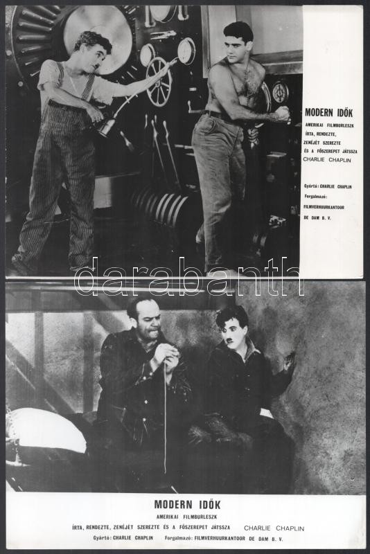 Charlie Chaplin: ,,Modern idők" című filmjének jelenetei és szereplői, 17 db vintage produkciós filmfotó, a használatból eredő (esetleges) kisebb hibákkal, ezüst zselatinos fotópapíron, 18x24 cm