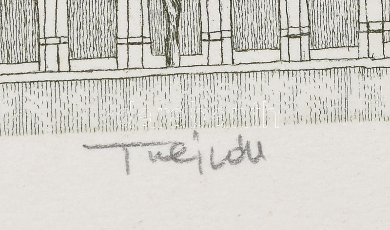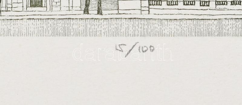 Beschreibung: Tulipán László (1943-2007): Budai vár. Rézkarc, papír, jelzett, számozott: 15/100. Hátoldalán Rézkarcoló Művészek Alkotóközössége bélyegzőjével. 19,5×26,5 cm