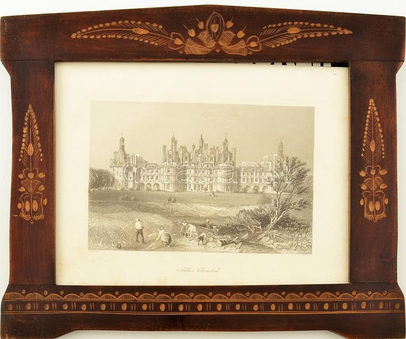 Beschreibung: Antoinette Asselineau (1811-1889), Haske metszése: Chambord kastélya, 1850-60 körül. Acélmetszet, papír, jelzett a metszeten. Dekoratív, virágos ornamentikával díszített régi üvegezett fakeretben. 13,5x19 cm