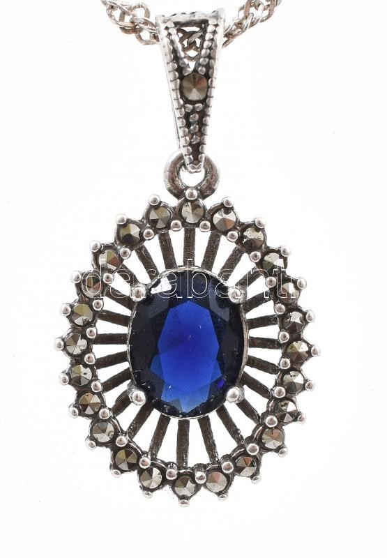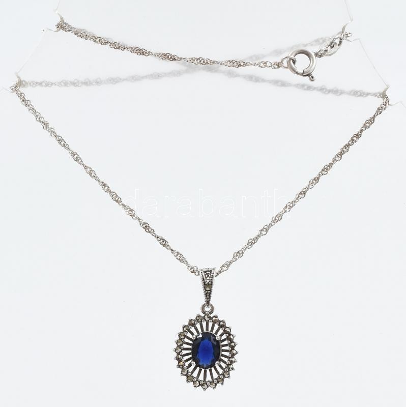 Beschreibung: Ezüst(Ag) csavart nyaklánc kék köves ovális medállal, jelzett, h: 36 cm, bruttó: 4,8 g