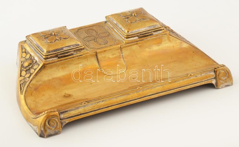 Beschreibung: Szecessziós kalamáris / tintatartó, ezüstözött alpakka, üvegbetét nélkül, kopott, jelzett, 24x15 cm