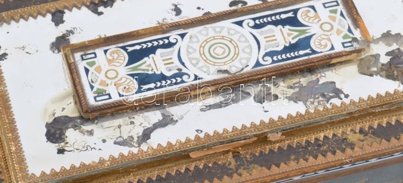 Beschreibung: Tükrös üveg, titkos fiókokat tartalmazó doboz, két olsalán a Munkácsy trilógia Ecce Homo és Golgota c. festménye. Kopott, sérülésekkel. 20,5x11,5 cm