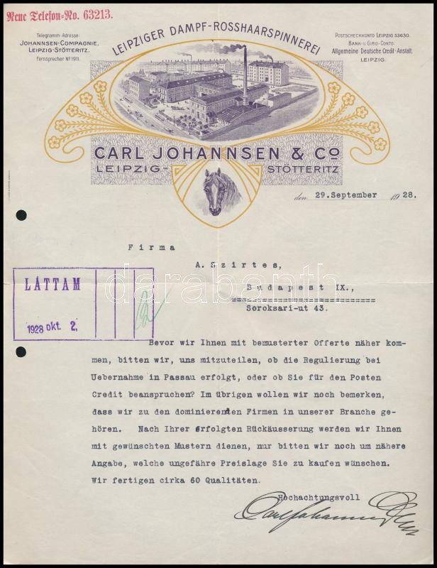 Beschreibung: 1928 Carl Johann & Co. szecessziós fejléces levélpapírjára írt levél