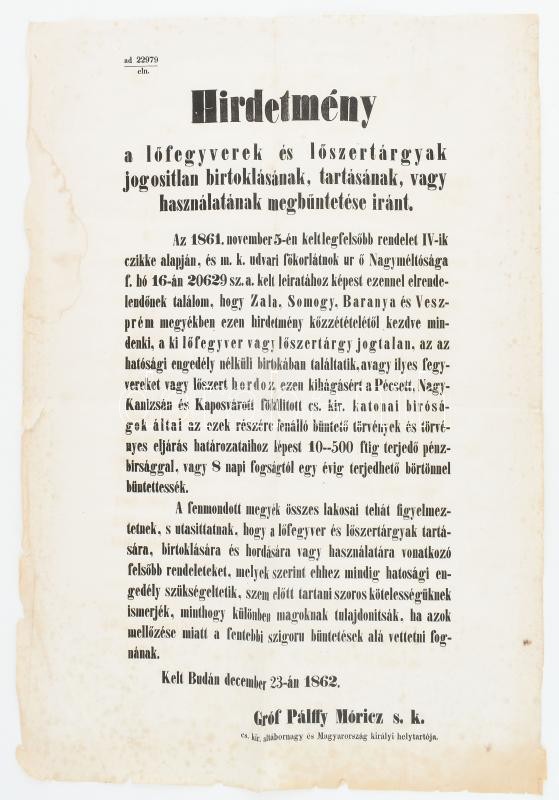 1862 gr. Pálffy Móricz lőszer és fegyvertartást szanckionáló rendelet,... https://www.darabanth.com/de/425-Fernauktion/425.0/Kunst-Dokumente-andere-Sammelgebiete/Drucksachen~1000002/1862-gr-Palffy-Moricz-loszer-es-fegyvertartast-szanckionalo-rendelet-hirdetmenye-34x53-cm~II2710795