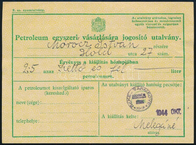 3 db 1944 októberi cukorjegy tasakok és petróleum utalvány https://www.darabanth.com/de/425-Fernauktion/425.0/Kunst-Dokumente-andere-Sammelgebiete/Drucksachen~1000002/3-db-1944-oktoberi-cukorjegy-tasakok-es-petroleum-utalvany~II2693053