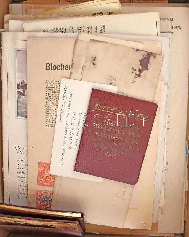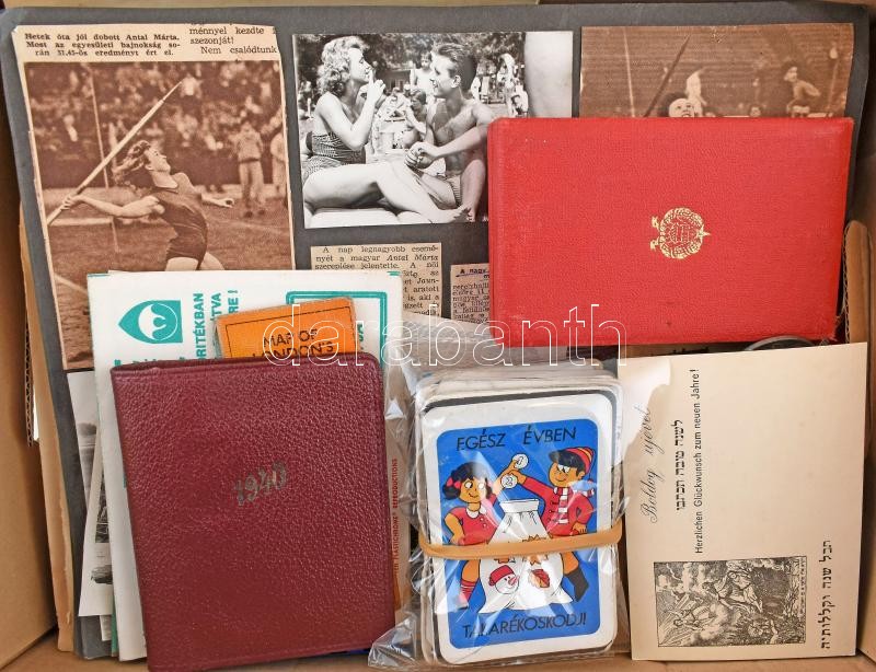 Egy nagyobb doboznyi vegyes papÃrrégiség, közte Antal Márta olimpikon fényképei, Magyar Siemens-Schuckert Művek 1940-es zsebnaptár, bizonyÃtványok, kártyanaptárak, stb. (Benne "Önkéntes Tűzoltói Szolgálatért X Éves" kitüntetés, mellszalagon + "A Haza Szolgálatáért ezüst fokozat" kitüntetés mellszalagon, tokban.)