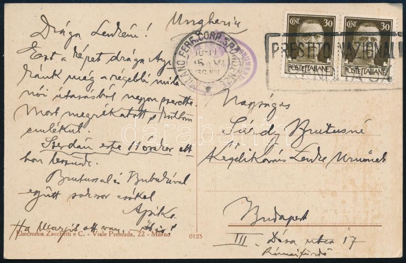 1936 Kézdi-Kovács László (1864-1942) festőművész, műkritikus autográf sorai lányához, Kézdi-Kovács Lenkéhez, vejéhez, Sárdy Brutus (1892-1970) festőművész, restaurátorhoz és unokájához, Sárdy Lóránt (1931-2014) későbbi festőművész, restaurátorhoz. Milánoból küldött képeslapon.
