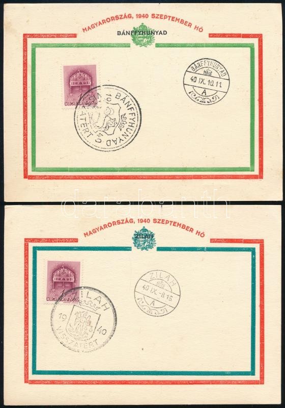 Beschreibung: 2 db erdélyi irredenta emléklap, Bánffyhunyad és Zilah "VISSZATÉRT" alkalmi bélyegzéssel, 15x11 cm
