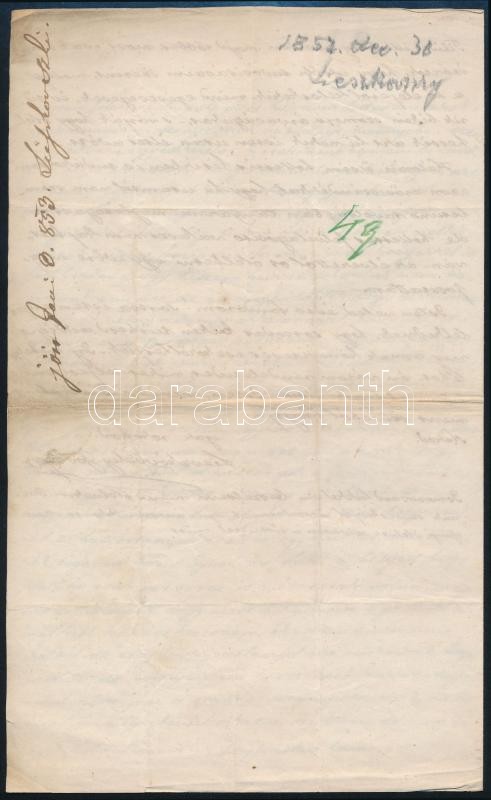 Érdekes 1848-as dokumentum: 1852 Csiky Sándor (1805-1892) nemzetőrparancsnok, politikus, egri polgármester, akit 1848-as tevékenysége miatt halálra ítéltek, majd az ítéletet várfogságra változtatták. Fogva tartása helyére Kufstein várába írott levél távoli rokonától felső-lieszkói Lieszkovszky József (1821-1861), szintén 1848-as honvéd hadnagytól, Heves megyei politikustól, aki fogságából épp akkor szabadult. Levelében ennek örömét és megindító voltát tudatja, valamint meleg szavakkal biztosítja Csiky-t hogy mindent meg fog tenni, hogy fogságában mind anyagi szempontból megkönnyítse. Három beírt oldal.