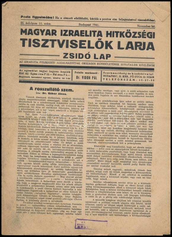1941 A Magyar Izraelita Hitközség Tisztviselők Lapja, zsidó lap III. é... https://www.darabanth.com/de/425-Fernauktion/425.0/Kunst-Dokumente-andere-Sammelgebiete/Judaica~500027/1941-A-Magyar-Izraelita-Hitkozseg-Tisztviselok-Lapja-zsido-lap-III-evfolyamanak-11-szama-~II2706270