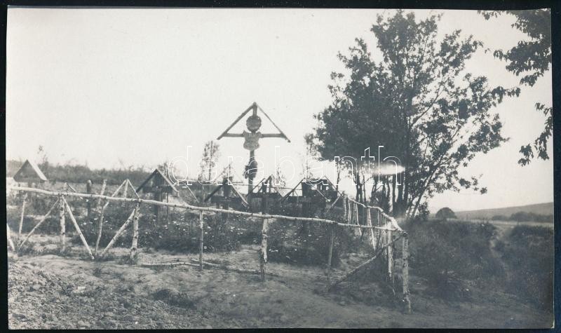 Beschreibung: cca 1915 Katonatemető Zboró (Felvidék) előtt, hátoldalon feliratozott fotó, 8×14 cm