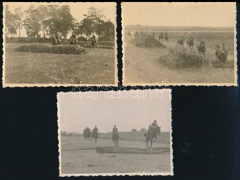 Beschreibung: cca 1938 Katonai lovas egység gyakorlatozása akadályfutással Szolnoknál, 3 db hátoldalon pecsételt fotó, 8,5×11,5 cm