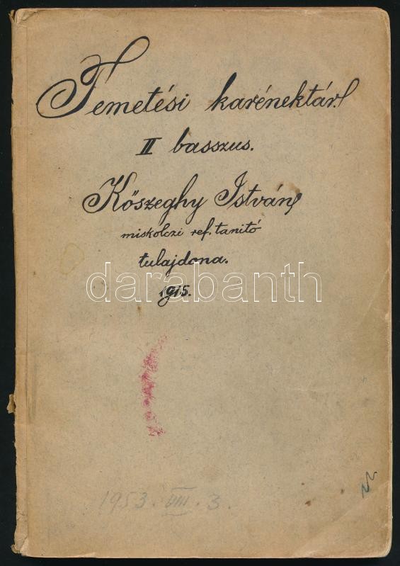 1915 Temetési karénektár, II. basszus, Kőszeghy István mikolczi ref. tanító tulajdona. Kézzel írt füzet kottákkal. Kissé sérült borítóval, helyenként foltos.