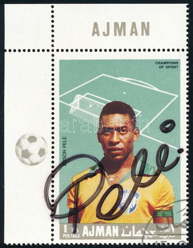 1968 Pelé, eredeti nevén Edson Arantes do Nascimento (1940-) háromszoros világbajnok brazil labdarúgó, minden idők egyik legnagyobb játékosának autográf aláírása, őt ábrázoló bélyegen