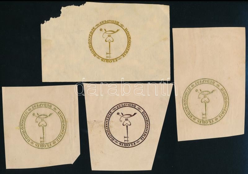 4 db Floris Bonbonnerie Budapest, art deco csokoládé termékcsomagolás vagy terv, 1925-30 körül. Részben sérült vagy vágott, kissé foltos. d: 5 cm körüli méretekben