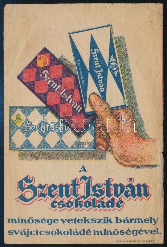 Szent István csokoládé reklámcédula, szélein kis szakadásokkal https://www.darabanth.com/de/425-Fernauktion/425.0/Kunst-Dokumente-andere-Sammelgebiete/Werbungen~500024/Szent-Istvan-csokolade-reklamcedula-szelein-kis-szakadasokkal~II2706593