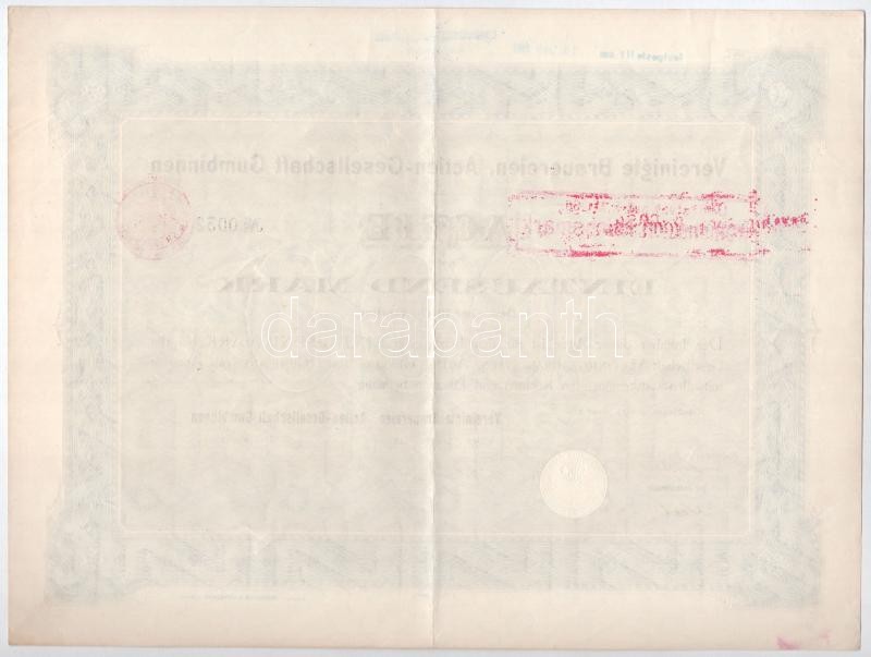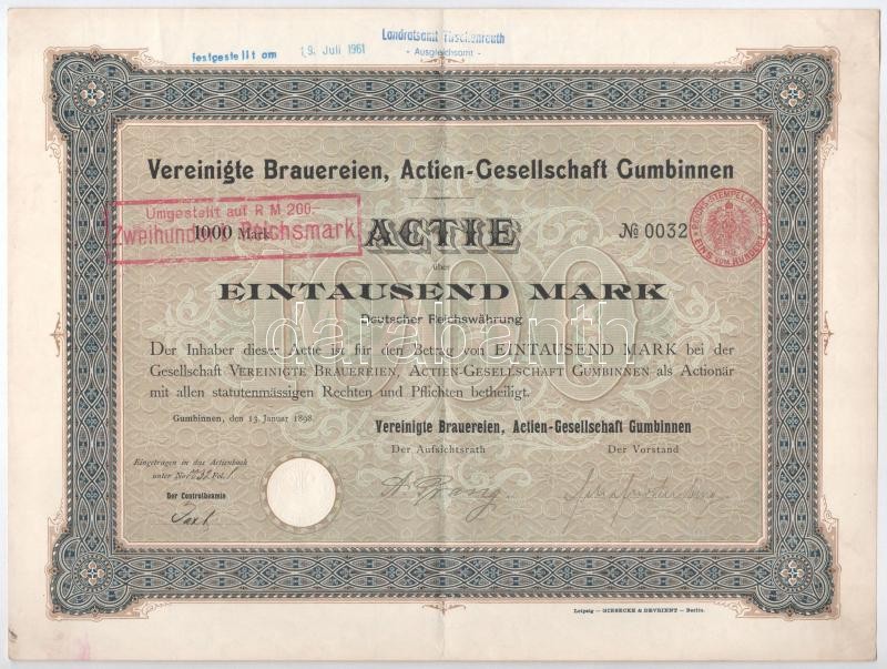Beschreibung: Német Birodalom / Gumbinnen 1898. "Egyesült Sörfőzdék Gumbinneni Részványtársasága" részvénye 1000M-ról szárazpecséttel, felülbélyegzésekkel T:II