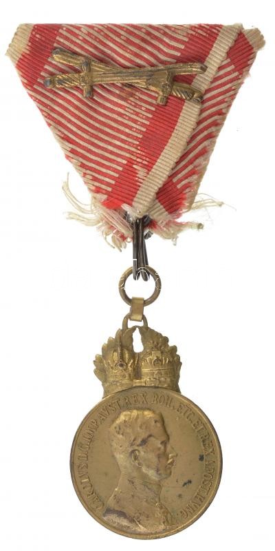 1917. "Károly Bronz Katonai Érdemérem a katonai érdemkereszt szalagján, kardokkal" aranyozott bronz kitüntetés, erősen kopott eredeti mellszalaggal, "BRONZE" jelzéssel a peremen. Szign.: Kautsch T:1-,2 kissé aranyozás kopott