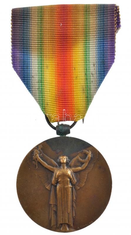 France 1922. " World War I Victory Medal / Allied Commemorative Medal" bronze decoration with ribbon. Sign.:A. Morlon C:XF patina, spotted ribbon
