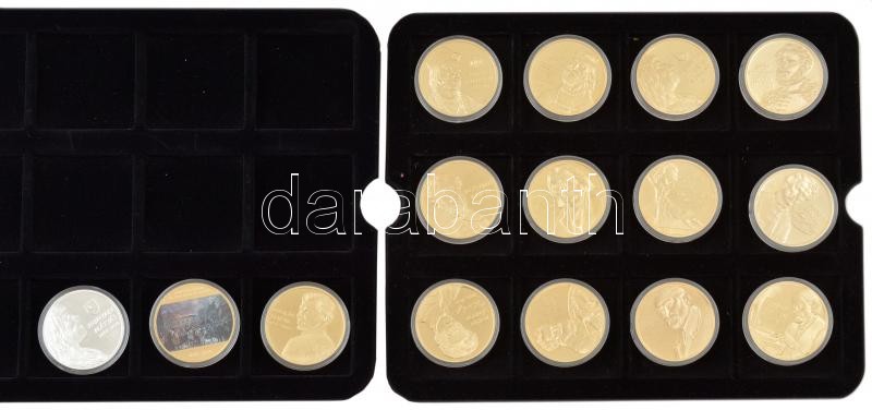 Beschreibung: ifj. Szlávics László (1959-) 2011. "Nagy Magyarok" 13xklf aranyozott Cu emlékérem + 1db ezüstözött Cu emlékérem, mind tanúsÃtvánnyal (40mm) + 2013. "Forradalom és szabadságharc 1848-1849 / A 170. évforduló emlékére" ezüstözött Cu emlékérem, multicolor tanúsÃtvánnyal (40mm), az egész "Nagy Magyarok" mahagóni fa érmetartó kazetta bársonybéléssel, 12db 50x50mm férÅ‘helyű kivehetÅ‘ tálcával T:PP