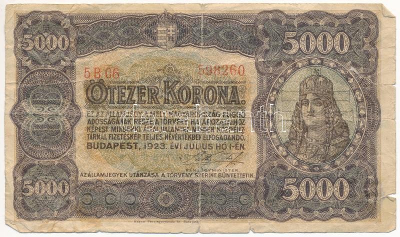 1923. 5000K "5B06 598260", "Magyar Pénzjegynyomda Rt. B... https://www.darabanth.com/de/425-Fernauktion/425.0/Numismatik/Ungarische-Banknoten~1500007/1923-5000K-5B06-598260-Magyar-Penzjegynyomda-Rt-Budapest-jelolessel-TIII-szakadasok-Ad~II2709455