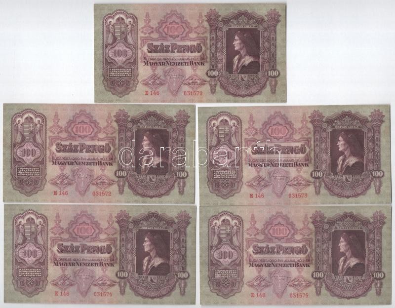 1930. 100P (5x) "E 146 031570 - E 146 031575", sorszámkövető... https://www.darabanth.com/de/425-Fernauktion/425.0/Numismatik/Ungarische-Banknoten~1500007/1930-100P-5x-E-146-031570-E-146-031575-sorszamkovetok-es-egyugrasu-sorszamokkal-TII-~II2706249