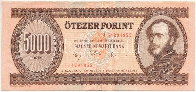 1992. 5000Ft "J 54294955" T:III Adamo F49 https://www.darabanth.com/de/425-Fernauktion/425.0/Numismatik/Ungarische-Banknoten~1500007/1992-5000Ft-J-54294955-TIII-Adamo-F49~II2708366