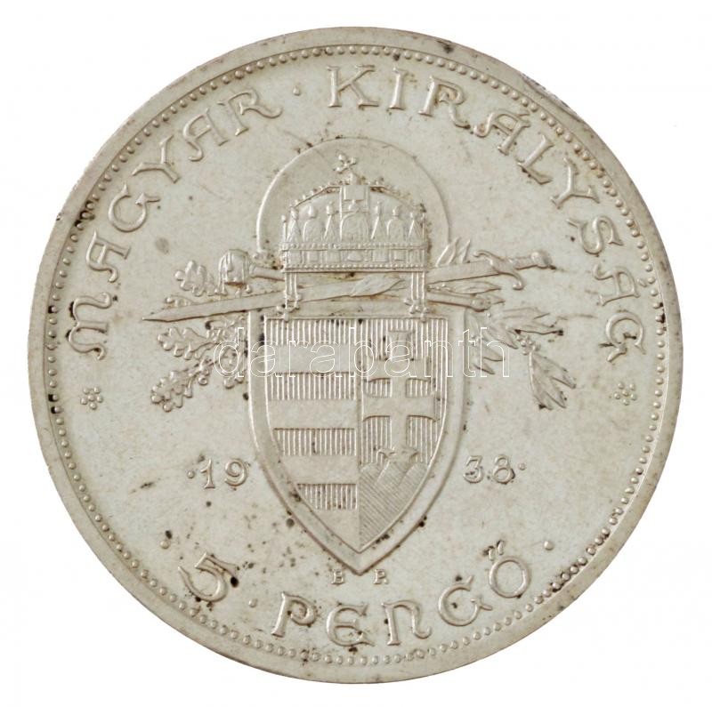 1938. 5P Ag "Szent István" T:1- Adamo P8.1 https://www.darabanth.com/de/425-Fernauktion/425.0/Numismatik/Ungarische-Munzen-und-Munzen-mit-ungarischem-Munzzeichen~1500008/1938-5P-Ag-Szent-Istvan-T1-Adamo-P81~II2706714