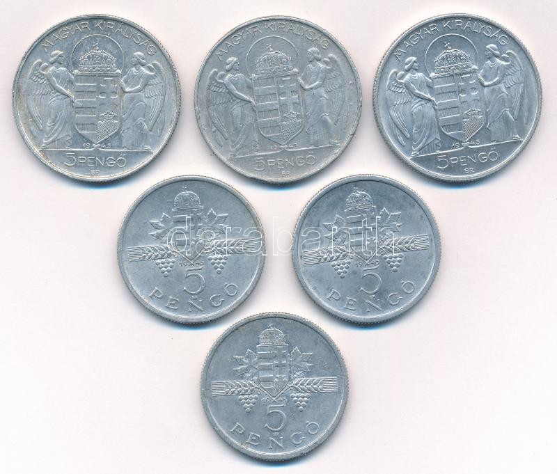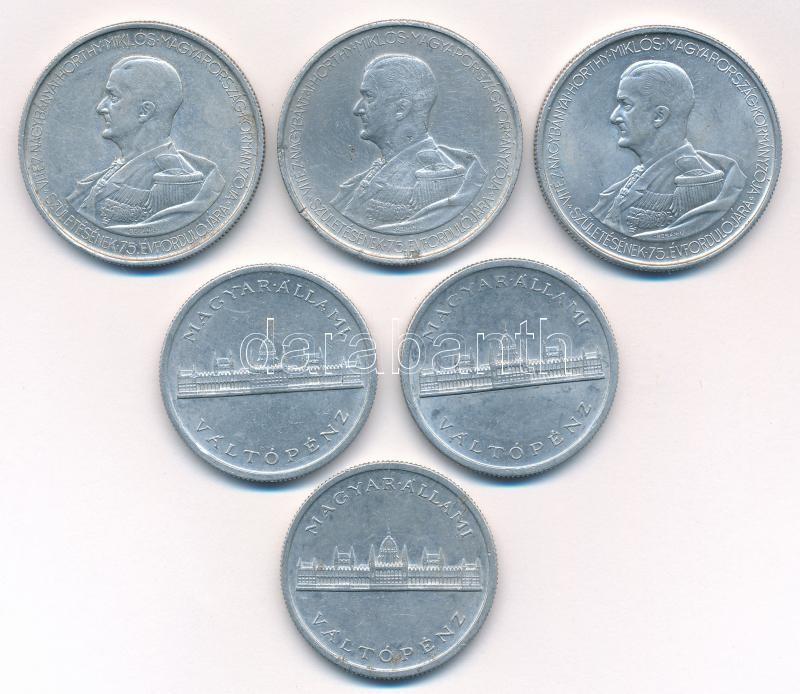 1943. 5P Al "Horthy Miklós születésének 75. évfordulója" (3d... https://www.darabanth.com/de/425-Fernauktion/425.0/Numismatik/Ungarische-Munzen-und-Munzen-mit-ungarischem-Munzzeichen~1500008/1943-5P-Al-Horthy-Miklos-szuletesenek-75-evforduloja-3db-plus-1945-5P-Al-Parlament-3db~II2703423