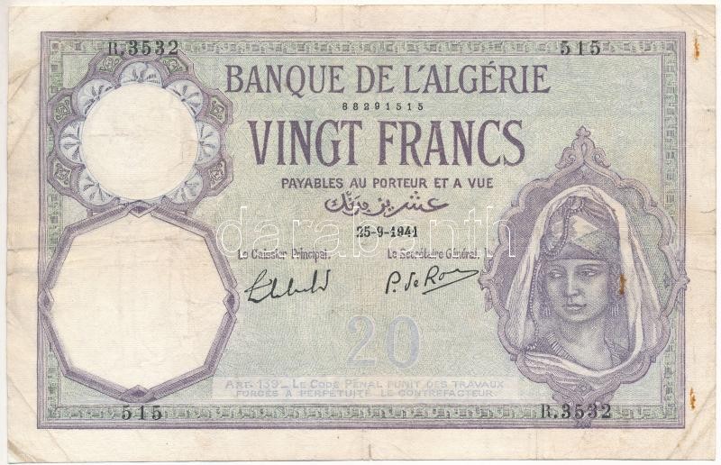 Beschreibung: Algéria / Szövetséges megszállás 1941. 20Fr "R. 3532 515" T:III folt, kis szakadás, tűzőgép lyuk