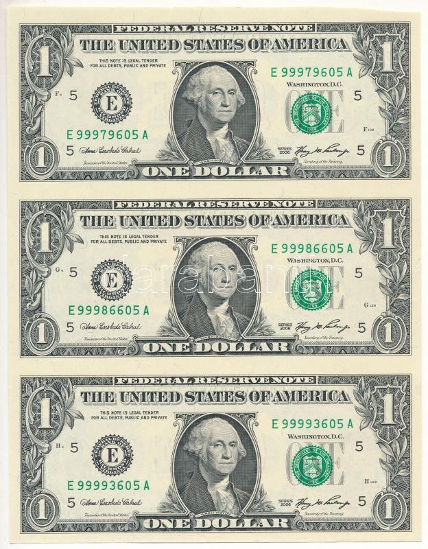 Amerikai Egyesült Államok 2006. 1$ "Anna Escobedo Cabral - Henry Merritt Paulson" zöld pecsét, 3db-os, hajtatlan ívben T:I,I- a felső részén vágáshiba