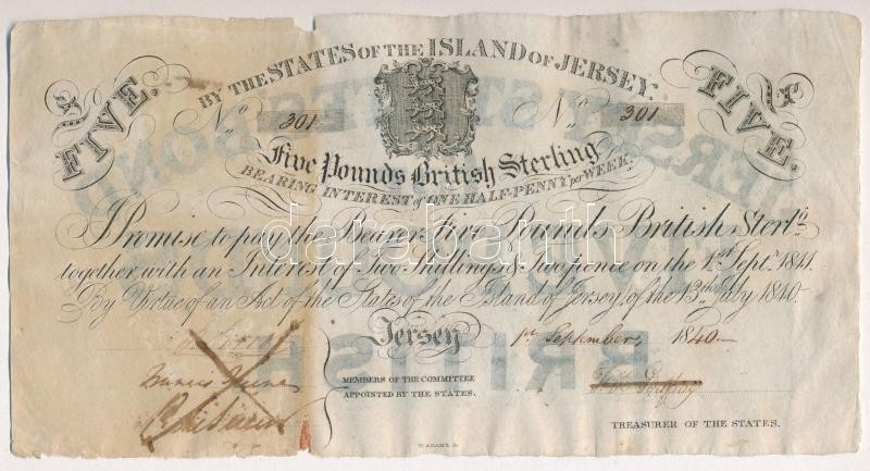 Beschreibung: Jersey 1840. 5P "301" vízjeles papíron, áthúzással érvénytelenítve T:III- folt, anyaghiány, ly.