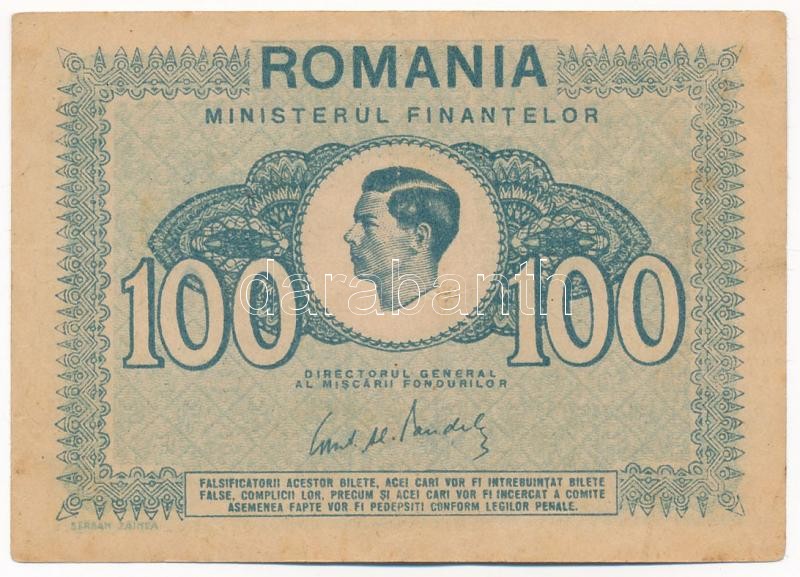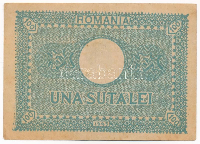 Romania 1945. 100... https://www.darabanth.com/de/425-Fernauktion/425.0/Numismatik/Weltweit-Banknoten~1500014/Romania-1945-100L-TIII-folt-kozepen-kis-szakadas-Romania-1945-100-Lei-CF-spot-small-tear-~II2703945