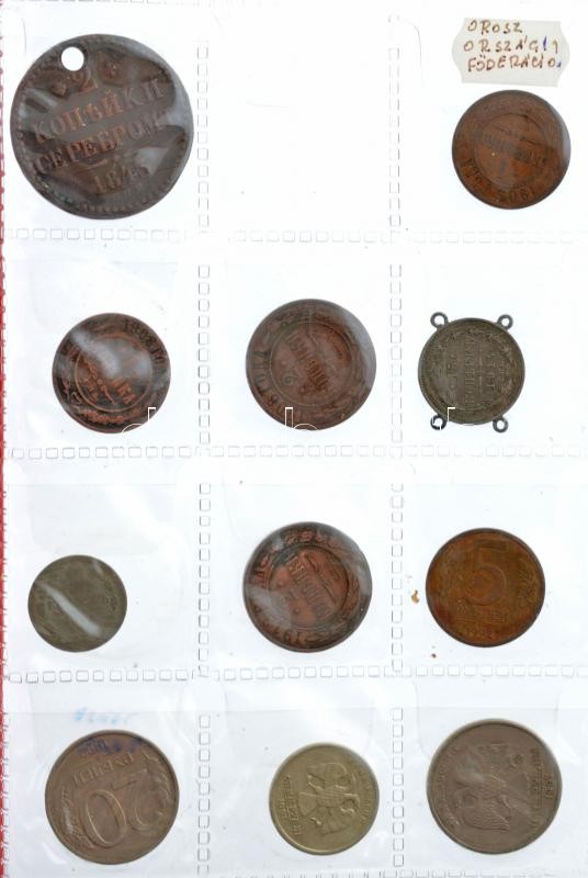 Beschreibung: 33db-os érmetétel kisalakú berakóban, főleg orosz érmékkel, közte 1843. 2k Cu (átfúrva) + 1895. 10k Ag (gyenge állapot) + 1915. 15k Ag (fülekkel) + 2001. 2R Cu-Ni "Gagarin űrutazásának 40. évfordulója" T:vegyes