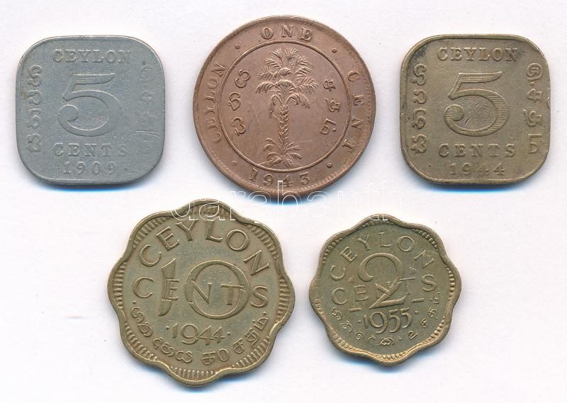 Beschreibung: Srí Lanka / Ceylon 1909. 5c Cu-Ni "VII. Eduárd" + 1943. 1c bronz "VI. György" + 1944. 5c-10c Ni-sárgaréz (2xklf) "VI. György" + 1955. 2c sárgaréz "II. Erzsébet" T:2-,3 patina, ph