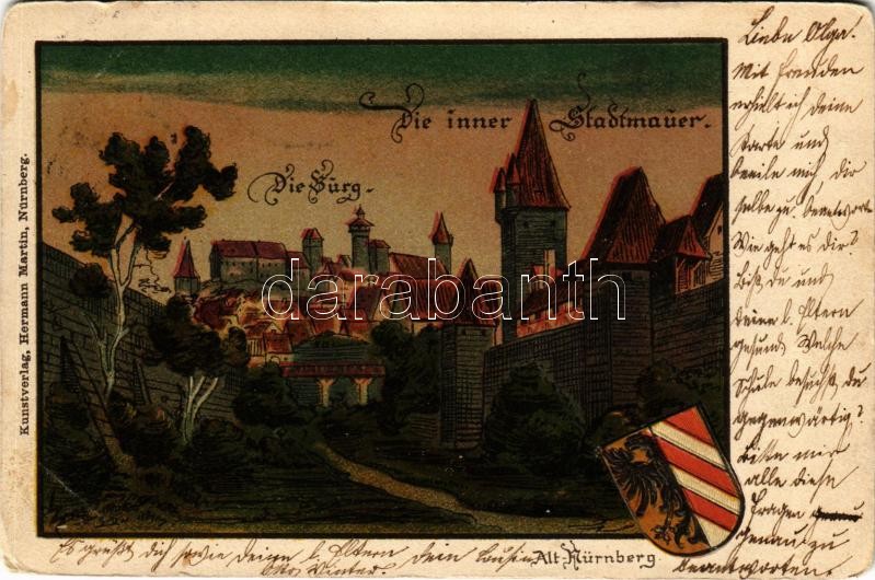 Beschreibung: 1902 Nürnberg, Nuremberg; Alt-Nürnberg. Die Burg, Die inner Stadtmauer / castle, castle wall. Kunstverlag Hermann Martin. Emb. coat of arms. litho (tiny pinholes)