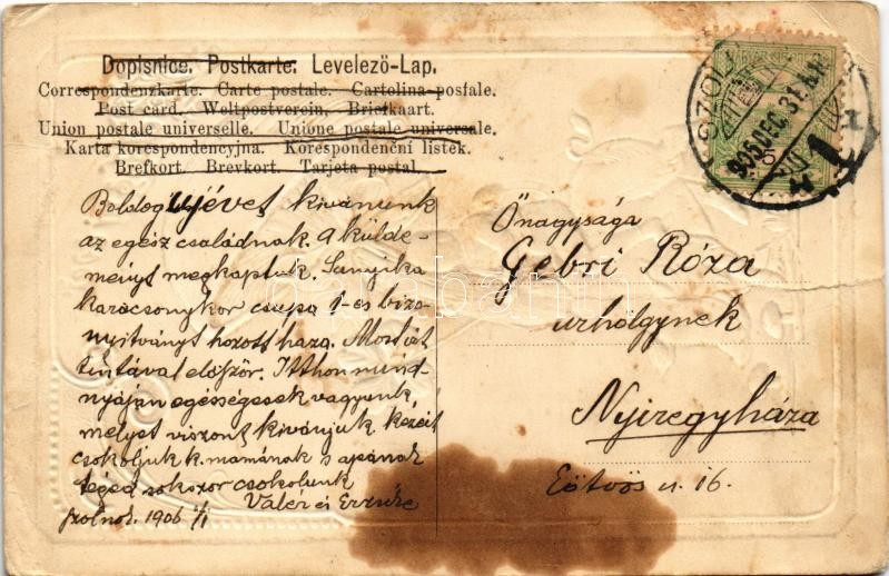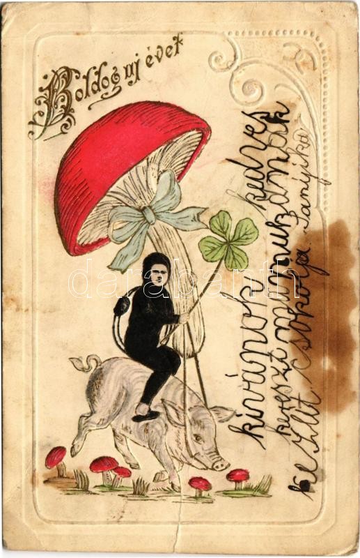 1905 Boldog Újévet! / New Year greeting art postcard with chimney sweeper riding a pig, giant mushroom, clover. Art Nouveau, Emb. litho (szakadás / tear)