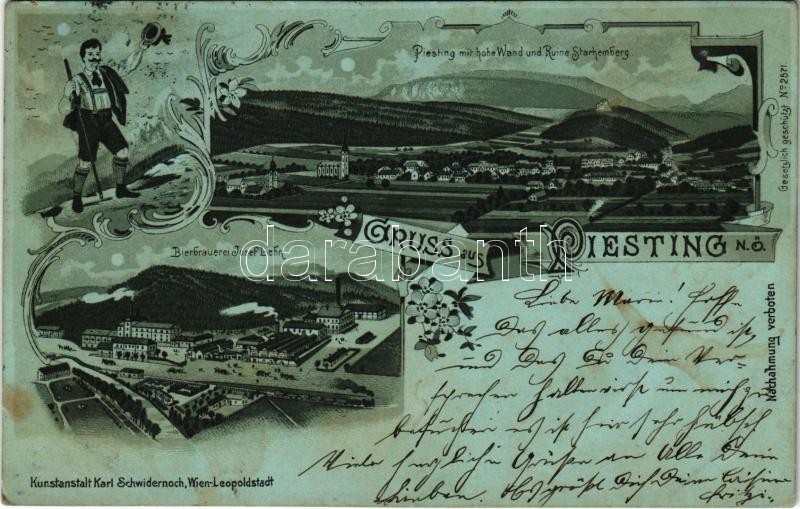 1903 Piesting, Bierbrauerei Josef Lehn, Piesting mit hohe Wand und Ruine Starhemberg / brewery, beer factory, general view with castle ruins. Kunstanstalt Karl Schwidernoch No. 2571. Art Nouveau, floral, litho (fl)