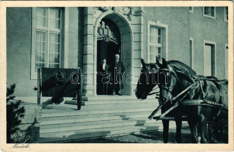 Ogrodzieniec, Neudeck; Reichspräsident von Hindenburg im Portal seines Hauses. Photographie und Verlag von Fritz Krauskopf / German President Paul von Hindenburg in the portal of his country residence, manor house, castle