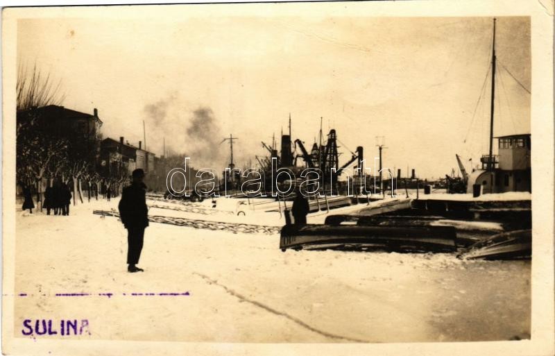 Sulina, port in winter after the storm. Foto Modern N. Teisano, photo https://www.darabanth.com/de/426-Fernauktion/426.0/Ansichtskarten/Rumanien~1500097/Sulina-port-in-winter-after-the-storm-Foto-Modern-N-Teisano-photo~II2720281