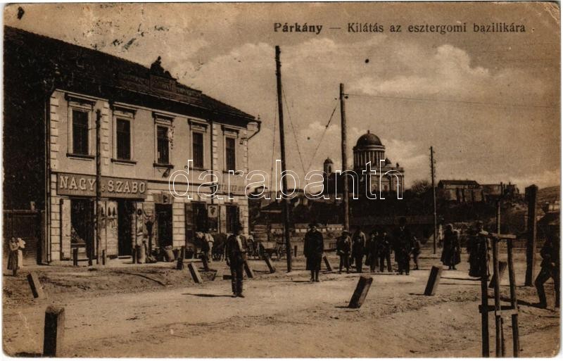 1918 Párkány, Stúrovo; Kilátás az esztergomi bazilikára, Nagy és Szabó, Steiner Mór üzlete, Esztergom-Megyei Párkányi Takarékpénztár. Vasúti levelezőlapárusítás 8321. / shops, square, savings bank (Rb)