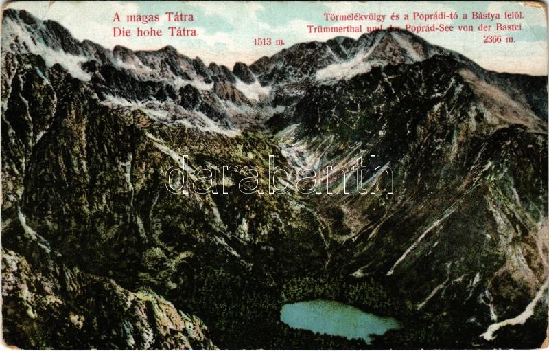 Tátra, Magas-Tátra, Vysoké Tatry; Törmelék-völgy (Omladék-völgy) és a Poprádi-tó a Bástya felől. Divald Károly műintézete 1979-1908. / Trümmerthal und der Poprád-See von der Bastei / Zlomiská, Zlomisková dolina, Popradské pleso / valley, lake (Rb)
