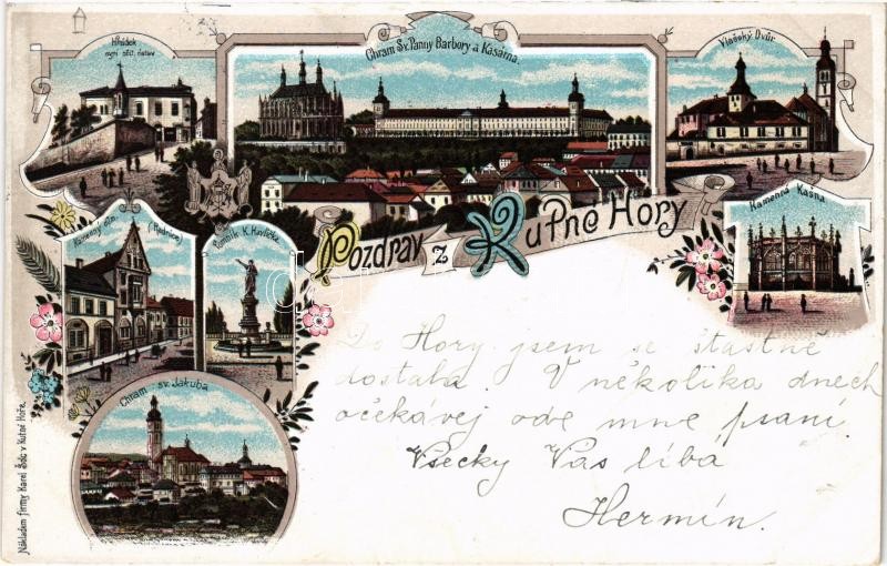 1897 (Vorläufer!) Kutná Hora, Hrádek, Chram Sv. Panny Barbory a Kasárna, Vlasoky Dvur, Kamenná Kasna, Pomník K. Havlicka, Kamenny dum (Radnice), Chram sv. Jakuba. Art Nouveau, floral, litho (EK)