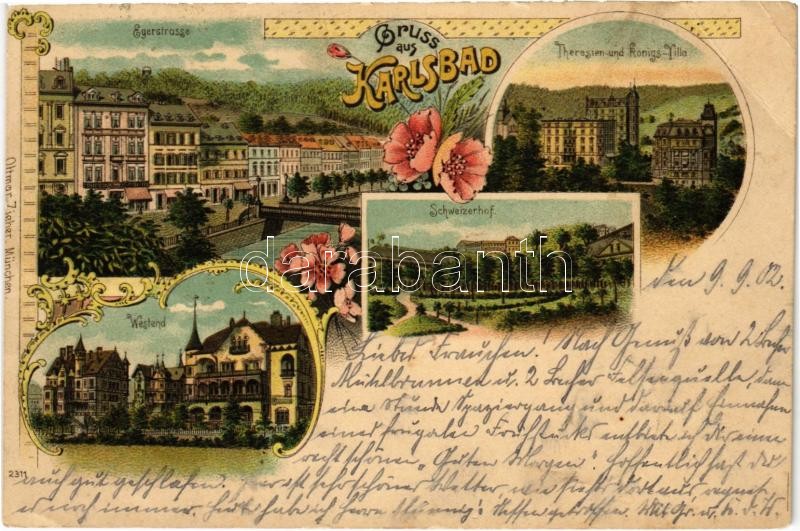 Beschreibung: 1902 Karlovy Vary, Karlsbad; Egerstrasse, Theresien und Königs-Villa, Westend, Schweizerhof. Ottmar Zieher Art Nouveau, floral, litho (pinhole)