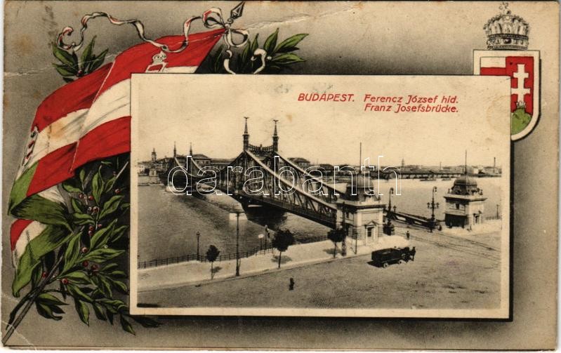 1917 Budapest, Ferenc József híd. Magyar zászlós és címeres keret (fa) https://www.darabanth.com/de/426-Fernauktion/426.0/Ansichtskarten/Ungarn~1500005/1917-Budapest-Ferenc-Jozsef-hid-Magyar-zaszlos-es-cimeres-keret-fa~II2720542