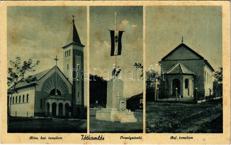 Tótkomlós, Római katolikus templom, Országzászló, Református templom. ... https://www.darabanth.com/de/426-Fernauktion/426.0/Ansichtskarten/Ungarn~1500005/Totkomlos-Romai-katolikus-templom-Orszagzaszlo-Reformatus-templom-Ozv-Dongo-Lajosne-k~II2717929