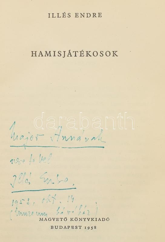 Illés Endre: Hamisjátékosok. A szerző, Illés Endre (1902-1986) író által Major Anna (1932-2021) dramaturg részére DEDIKÁLT példány. Bp., 1958., Magvető. Kiadói foltos egészvászon-kötés, kiadói szakadt papír védőborítóban, foltos lapokkal.