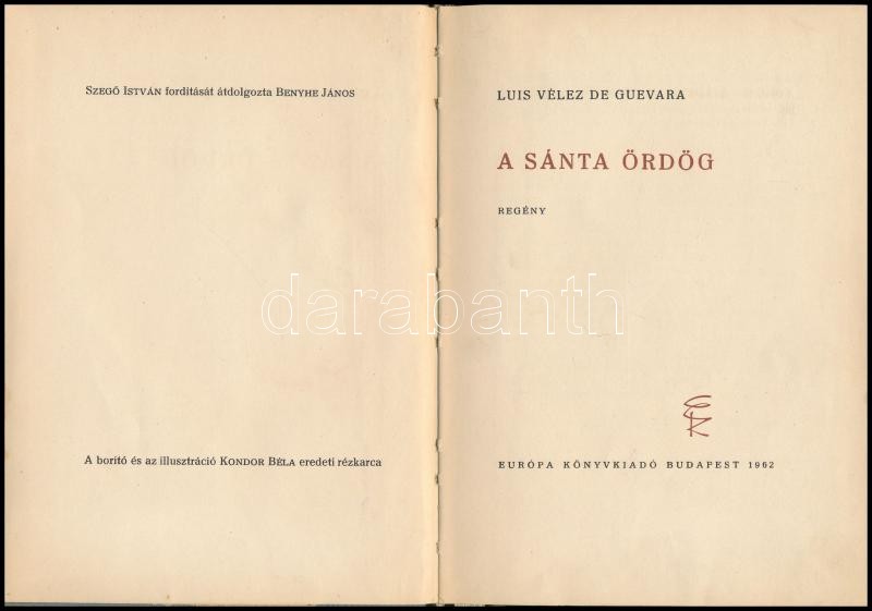 Luis Vélez de Guevara: A sánta ördög. Szegő István fordítását átdolgozta: Benyhe János. Kondor Béla rézkarcaival. Bp., 1962, Európa. Egyetlen magyar kiadás. Kiadói egészvászon-kötés, kissé foltos borítóval, a borítón ragasztással, intézményi bélyegzőkkel, volt könyvtári példány. Megjelent 5000 példányban.